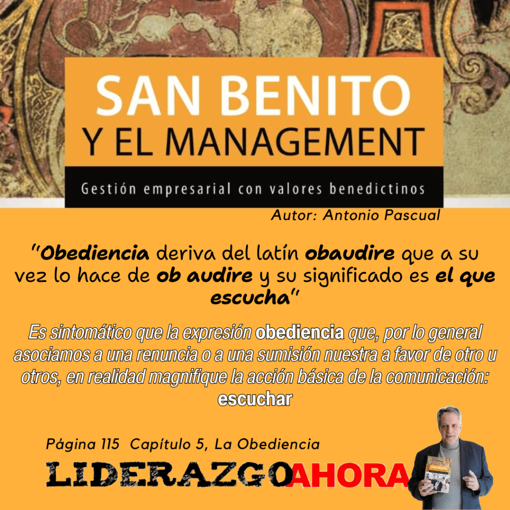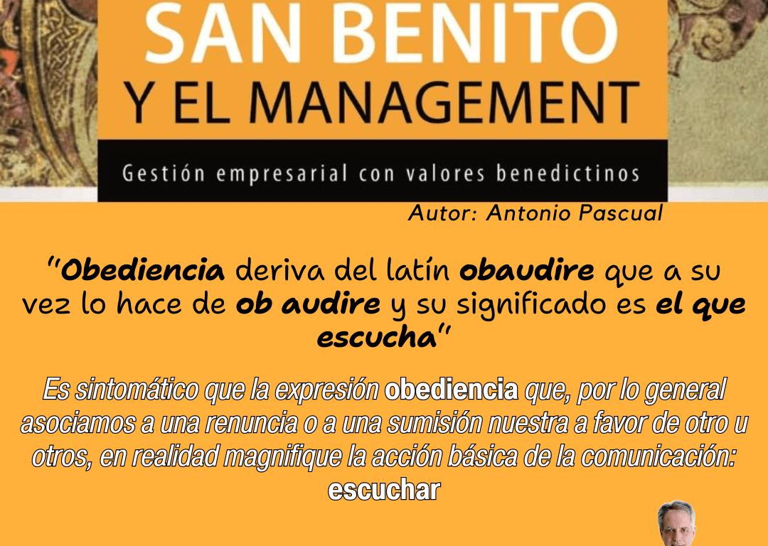 Cuando desarrollaba el ‘asunto’ de la Obediencia en mi libro San Benito y el Management, lo hacía analizando la perspectiva histórica del momento en el que #SanBenito de Nursia redactó su Santa Regla y me llamaba poderosamente la atención su interés en una #Obediencia ciega, lógicamente encauzada a cumplir con los preceptos vertidos en los libros sagrados conocidos en aquella época. Lo pude entender cuando comprendí el verdadero valor y significado del vocablo en cuestión, expuesto en la propia imagen que ilustra este post.